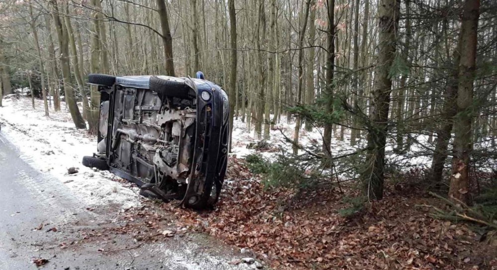 Řidič osobního auta havaroval u Želiva. Převrátil se na bok a zranil se