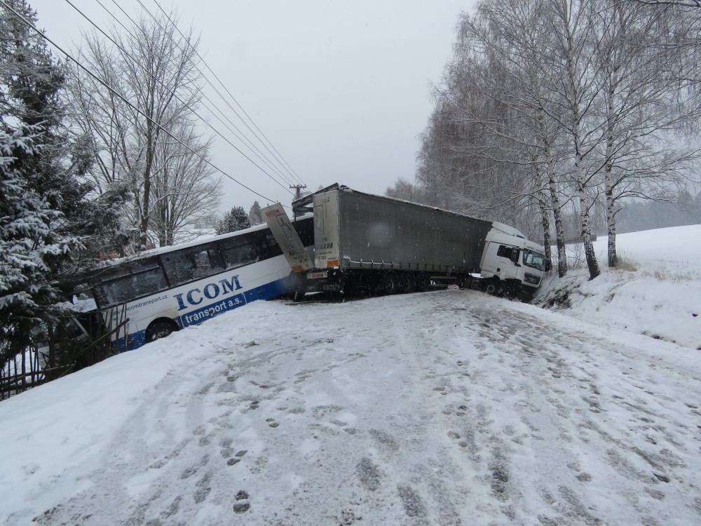 FOTO: Policisté od rána evidují skoro čtyřicet nehod. Boural třeba i autobus s náklaďákem