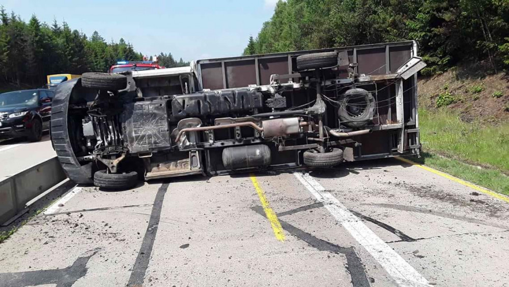 Dálnice D1 ve směru na Prahu je neprůjezdná kvůli nehodě kamionu. Převrátil se na bok