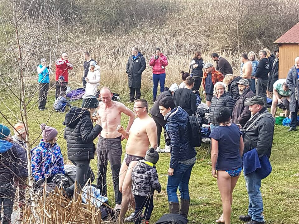 Stmelovací akce v ledové vodě. V Kostelní Myslové se v neděli koupalo na čtyřicet otužilců