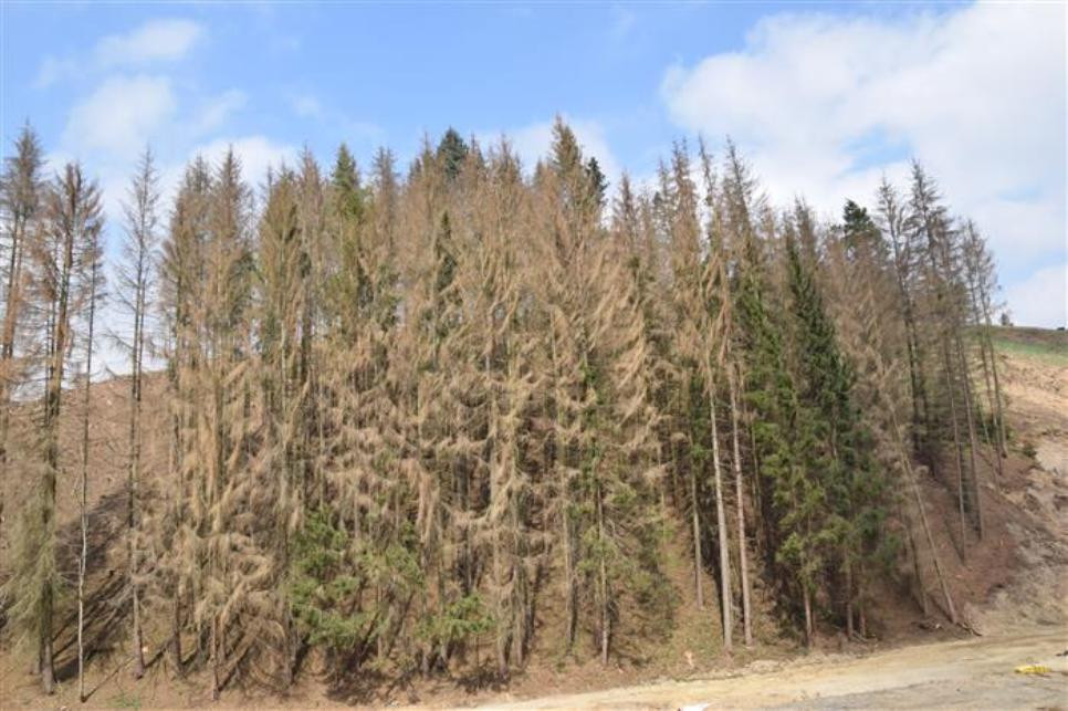 Zasažený lesní porost v okolí budoucího obchvatu II/602 Velký Beranov