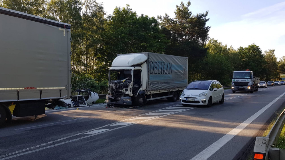 FOTO: U Stříteže bourala dvě nákladní auta. Na silnici I/38 se od rána tvoří dlouhé kolony