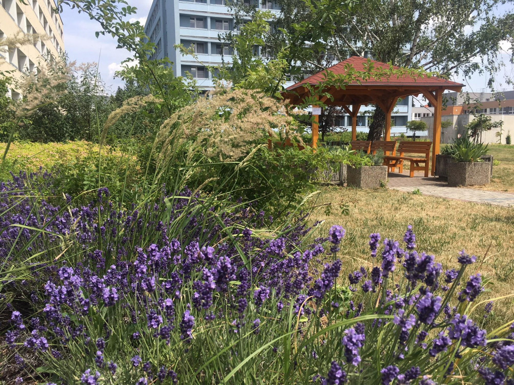 Pacienti nemocnice mohou odpočívat nebo hrát karty v novém altánu. Vyrobili ho studenti