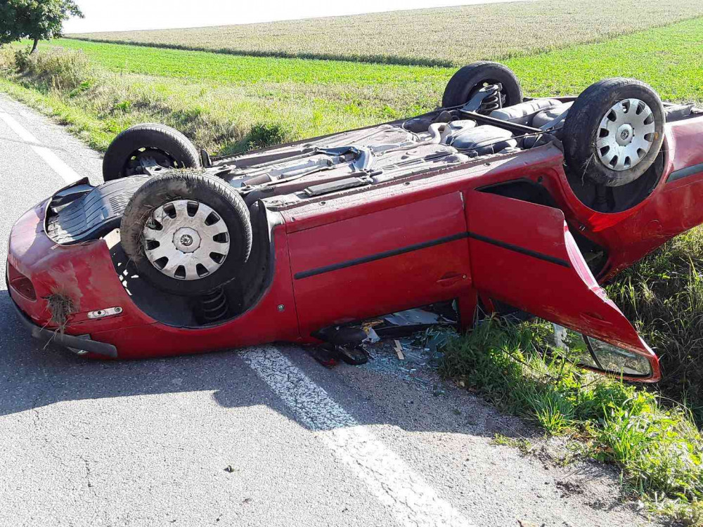 Výsledkem nehody náklaďáku s osobákem je zraněná řidička. Její auto skončilo na střeše
