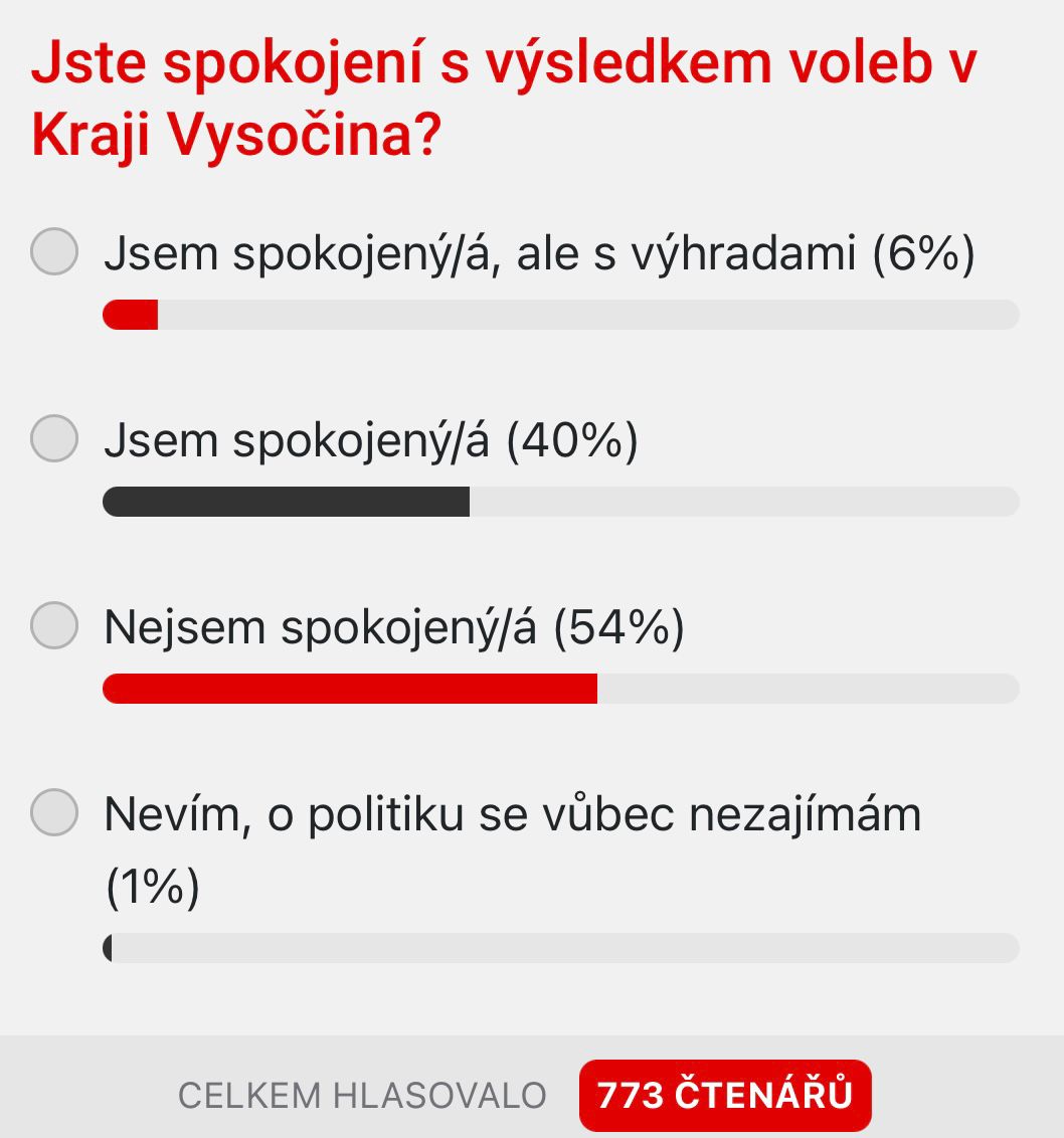 Anketní otázku ve znění: Jste spokojení s výsledkem voleb v Kraji Vysočina? jsme čtenářům položili v sobotu 4. října kolem 19. hodiny, reagovalo na ni 773 čtenářů. Čtenáři měli na výběr ze čtyř možných odpovědí. První „Jsem spokojený/á, ale s výhradami" zvolilo 44 čtenářů (6%). Další možnou odpověď „Jsem spokojený/á vybralo 307 čtenářů (40%). 417 čtenářů (54%) se přiklonilo k odpovědi „Nejsem spokojený/á". Pět čtenářů (1%) uvedlo, že neví, že se o politiku nezajímají.