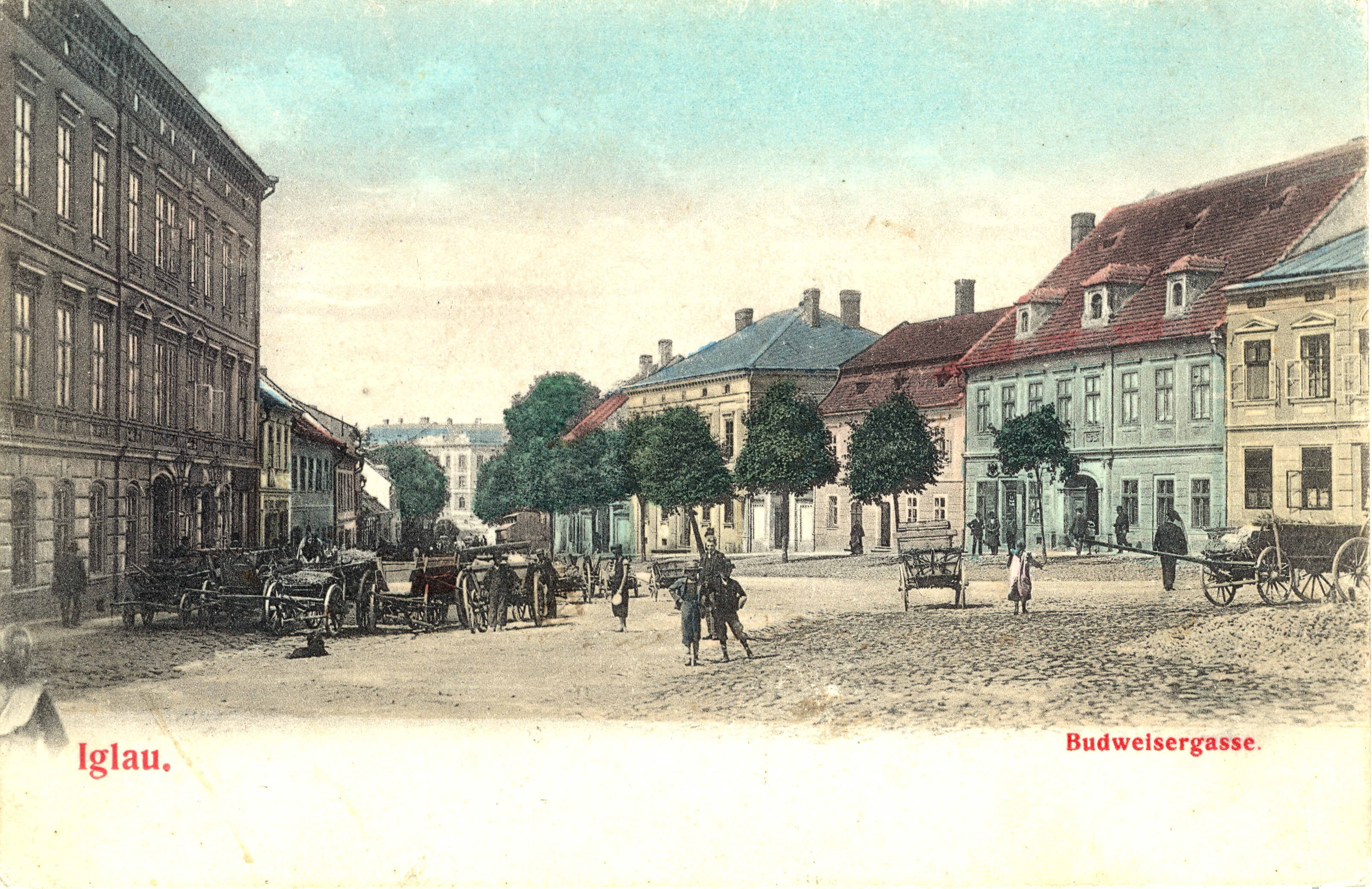 Všední den na náměstíčku na východním konci Budweisergasse před rokem 1900. Zcela vlevo dvoupatrový Hotel Czap. Kolorovaná pohlednice, foto: Poskytl Stanislav Jelínek