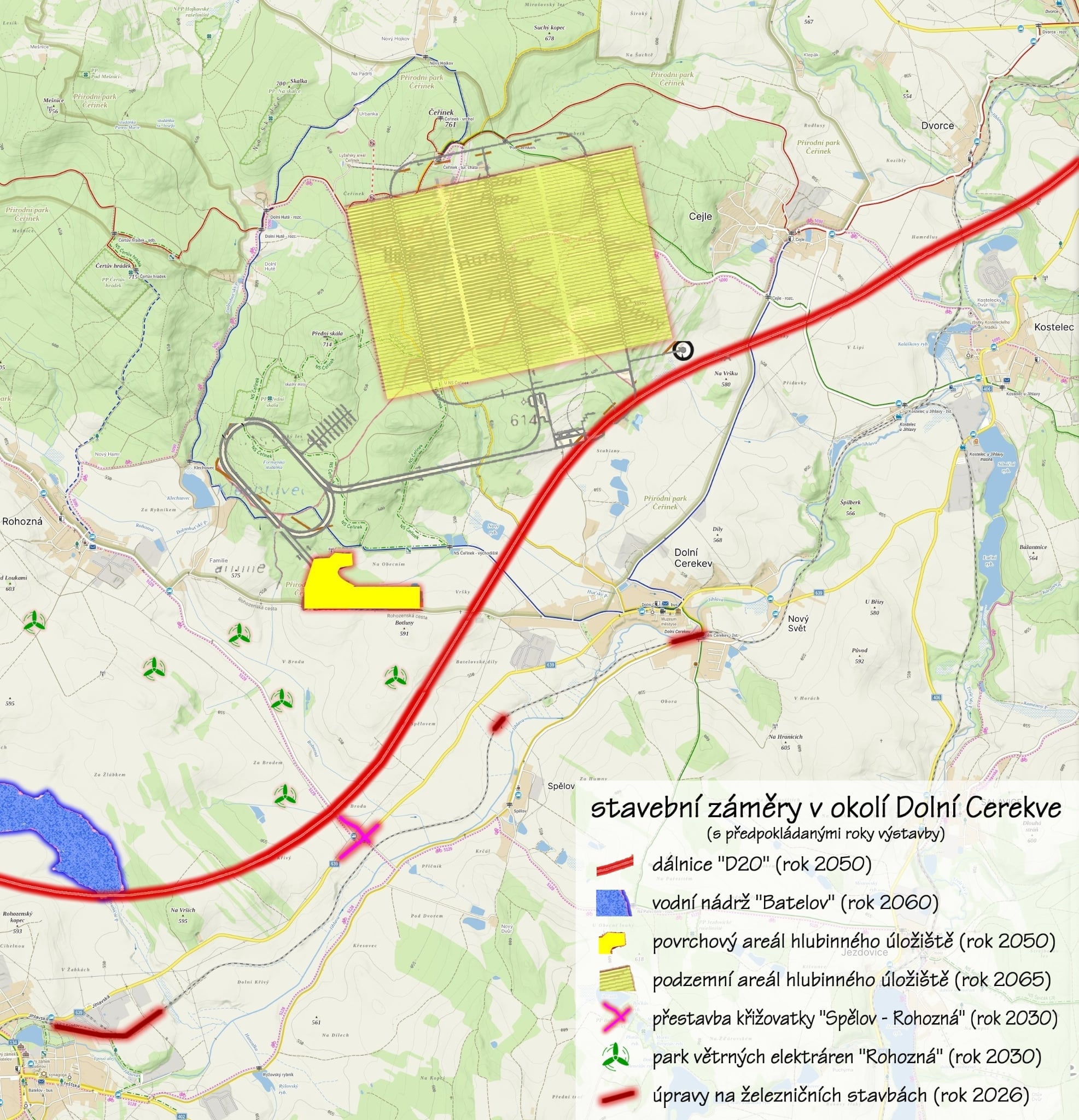 Čtenáře Jihlavské Drbny zaujal článek o připravované dálnici D20, která by měla propojit Jihlavu a Plzeň. S radnicí Dolní Cerekve o trase nikdo nejednal, starosta Zdeněk Dvořák se však dostal k přesně zakreslené navržené trase. Z mapy je patrné, že by dopravní tepna vedla velmi blízko zastavěného území, mezi městysem a zamýšleným skladem vyhořelého jaderného paliva. „Není to jen o úložišti. V minulosti se s námi projednávalo možné umístění nové vodní nádrže mezi Batelovem, Rohoznou a Dolní Cerekví. Jsme i v hledáčku firem, které by chtěly stavět větrné elektrárny,“ vyjmenoval starosta.