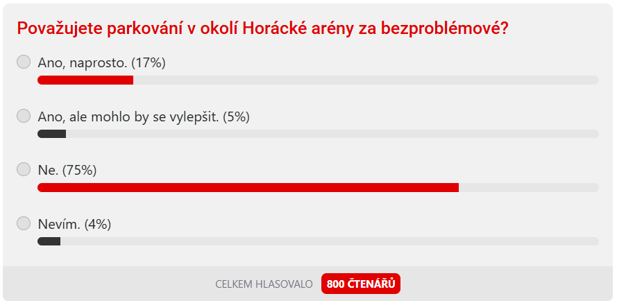 Redakce Jihlavské Drbny se svých čtenářů na toto téma zeptala. Anketní otázka zněla: „Považujete parkování v okolí Horácké arény za bezproblémové?“ Do 7.00 v sobotu 7. února hlasovalo přesně osm set čtenářů. Pro tři čtvrtiny z nich je parkování problematické. Sedmnáct procent považuje parkování za naprosto bezproblémové, pět procent sice souhlasí, ale vidí prostor ke zlepšení, a čtyři procenta zvolila možnost „nevím“.