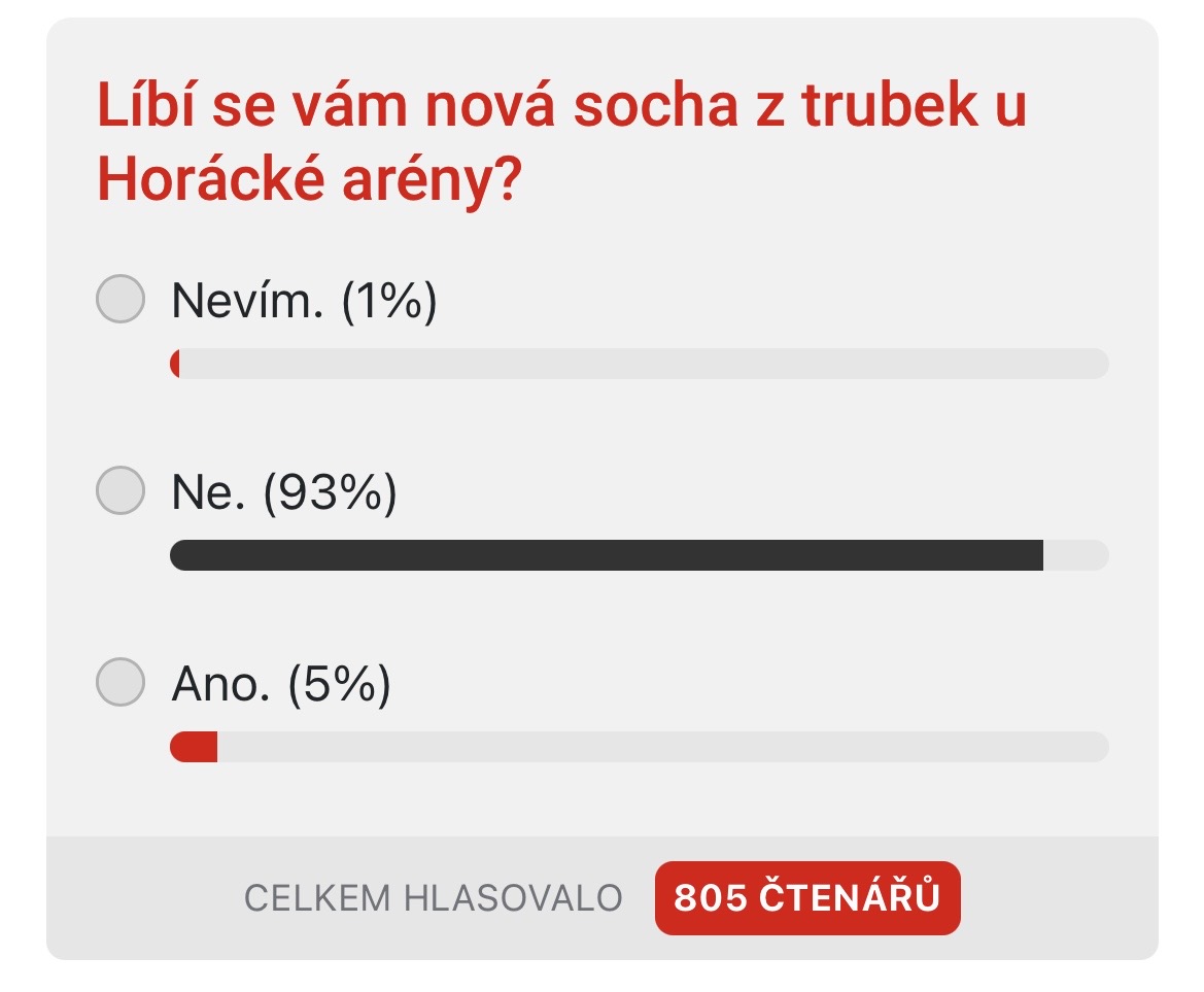 Názor čtenářů zjišťovala i naše redakce prostřednictvím ankety. Tu jsme vydávali ve středu 5. listopadu. Svůj názor v anketě vyjádřilo ke včerejší 20. hodině 805 čtenářů. Odpovídali na otázku ve znění: Líbí se vám nová socha z trubek u Horácké arény? Celkem 752 čtenářům (93%) se novinka nelíbí, zvolili možnost „ne“. Opačný názor – možnost „ano“ vybralo 43 čtenářů (5%). Poslední možností v hlasování – nevím – zvolilo 10 čtenářů (1%). Z výsledků tedy vyplývá, že drtivě většině čtenářů Jihlavské Drbny se nové dílo Krištofa Kintery nelíbí.
