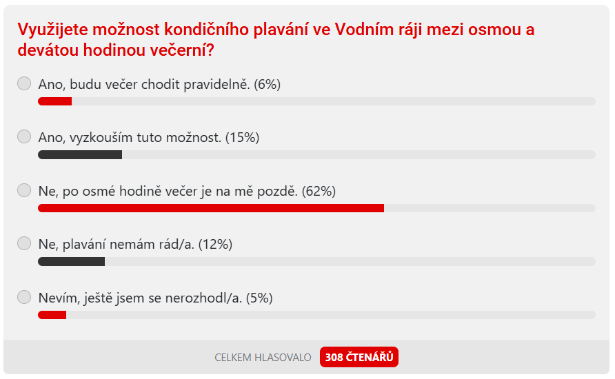 Do ankety, která probíhala přesně měsíc, tedy od 21. října do 21. listopadu, se se svým názorem do dnešní 19. hodiny zapojilo 308 čtenářů. Anketní otázka zněla: Využijete možnost kondičního plavání ve Vodním ráji mezi osmou a devátou hodinou večerní?
