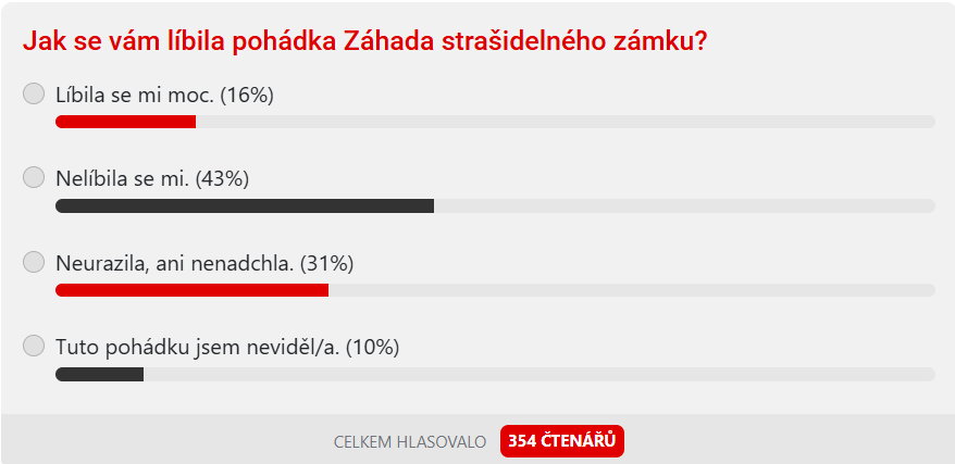 Nová pohádka velké nadšení nevzbudila. Líbila se 16 % čtenářům, opačný názor mělo 43 % respondentů. Neutrálně se vyjádřila skoro třetina hlasujících, konkrétně 31 %.