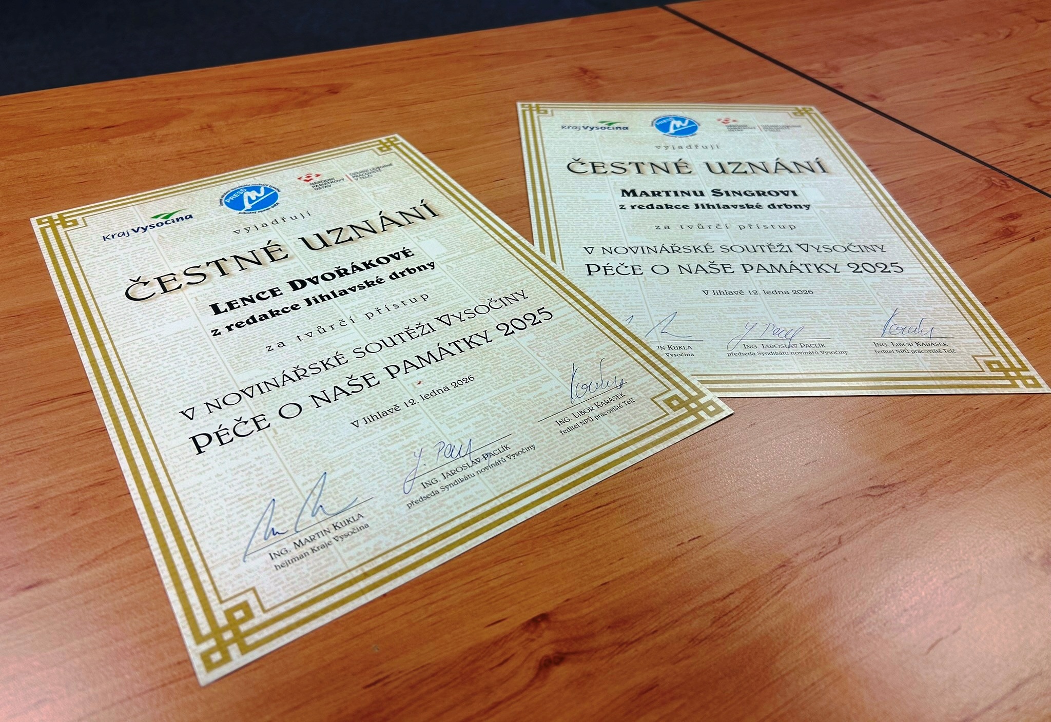 Syndikát novinářů na Vysočině uspořádal další ročník autorské soutěže Péče o naše památky. Také za uplynulý rok 2025 se jí mohli zúčastnit jak novináři, tak i kronikáři. Svá želízka v ohni měla také redakce Jihlavské Drbny, která se dočkala hned dvou ocenění.