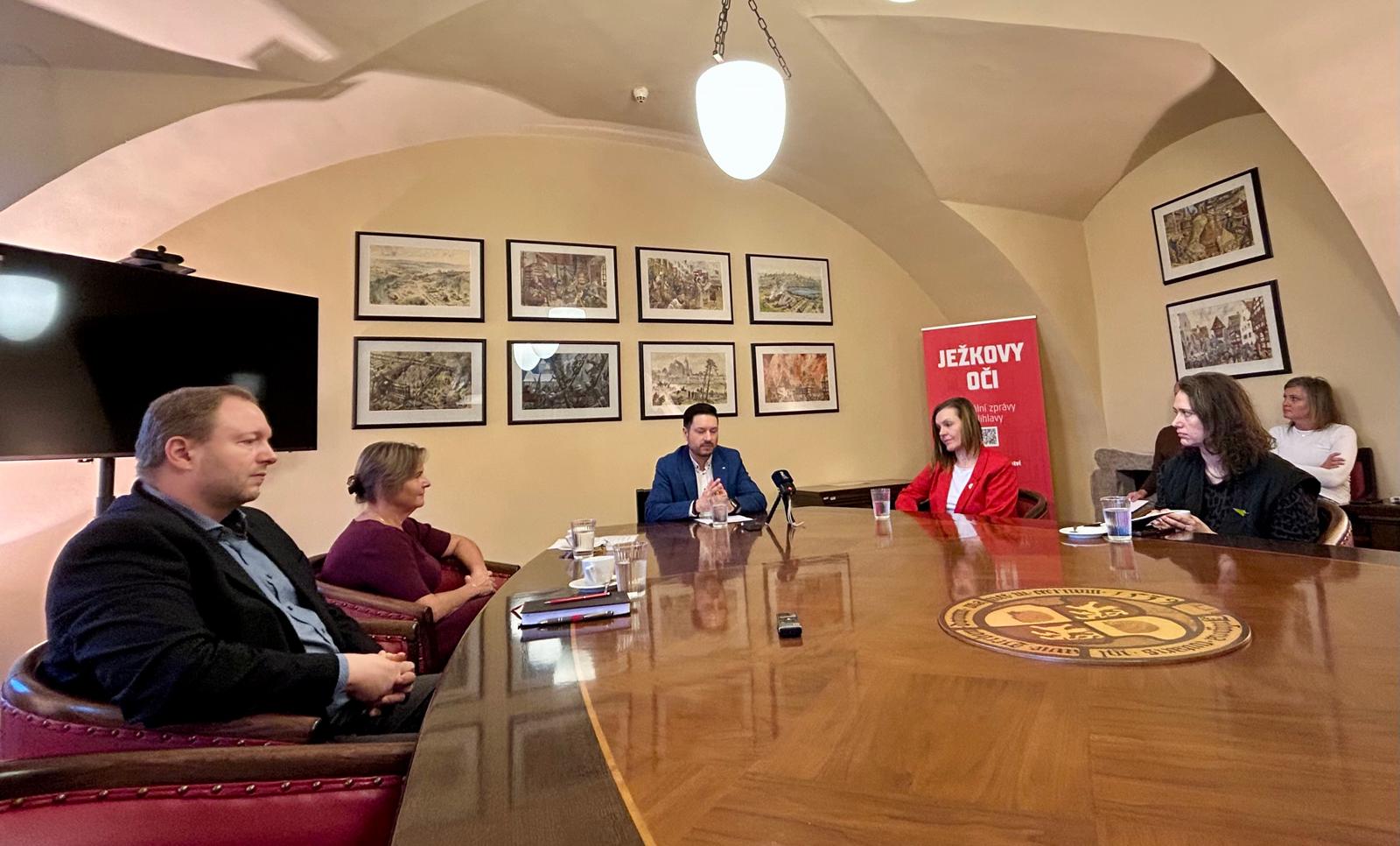 Tisková konference k projektu Obleč Jihlavu. Zleva: Marek Mašát, Dana Pavlousková, Richard Šedivý, Ilona Loužecká a Hana Zoor Svačinková. Foto: Lenka Dvořáková Kromě kontejnerů mohou lidé vyřazený textil nosit do Centra humanitární pomoci, které má sídlo v Okružní ulici. K tomu je dvakrát do roka v Jihlavě městského vlakového nádraží přistaveno nákladní auto zmíněné Diakonie Broumov, kam také lze donést textil.