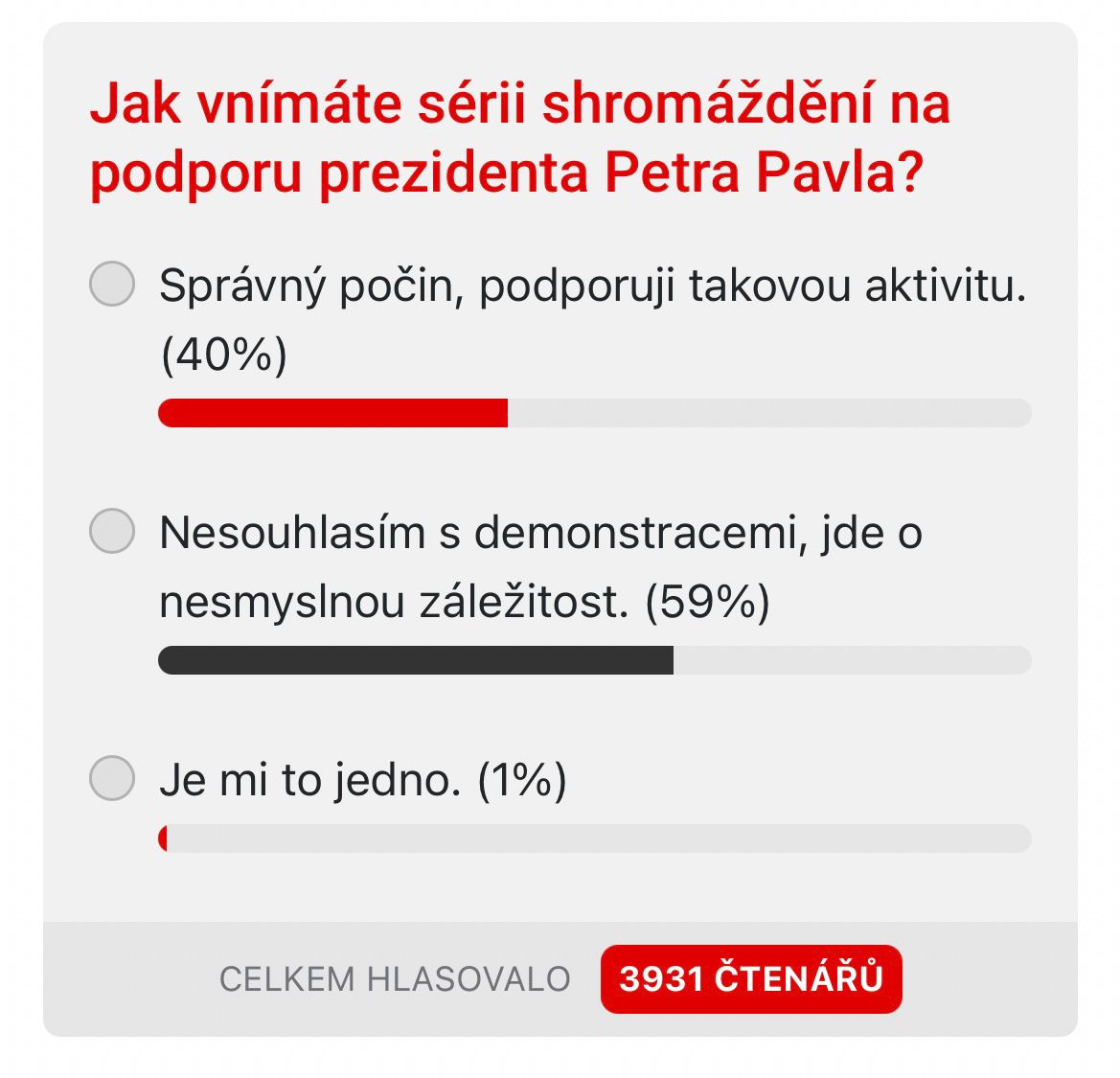 Těm jsme v sobotu 14. února položili anketní otázku ve znění: Jak vnímáte sérii shromáždění na podporu prezidenta Petra Pavla? K dnešní deváté hodin ranní na ni zodpovědělo 3931 čtenářů. První možnost – tedy Správný počin, podporuji takovou aktivitu – zvolilo 1572 čtenářů (40%). Opačný názor „Nesouhlasím s demonstracemi, jde o nesmyslnou záležitost“ zastává 2338 čtenářů (59%). Neutrální názor („Je mi to jedno“ má 22 čtenářů (1%). Z výsledků tedy vyplynulo, že více než polovina čtenářů Jihlavské Drbny považuje uplynulou sérii demonstrací za nesmyslnou záležitost.