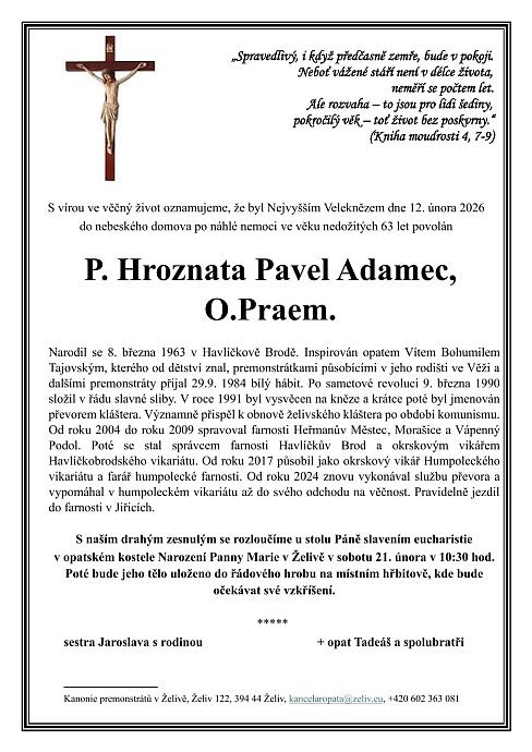 Ve věku nedožitých 63 let po náhlé nemoci zemřel převor želivského kláštera Pavel Hroznata Adamec. Rozloučení s tímto duchovním, který se narodil v Havlíčkově Brodě, se uskuteční v sobotu 21. února v 10:30 v kostele Narození Panny Marie v Želivě.