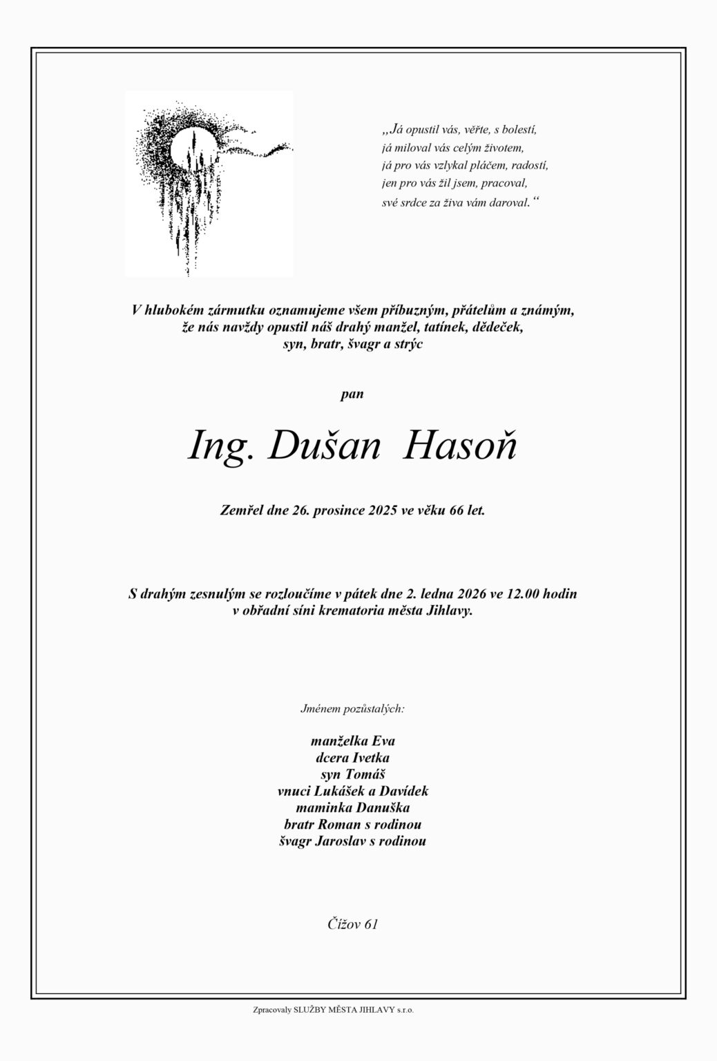 Poslední rozloučení s Dušanem Hasoněm proběhne v pátek 2. ledna ve 12 hodin v obřadní síni jihlavského krematoria.