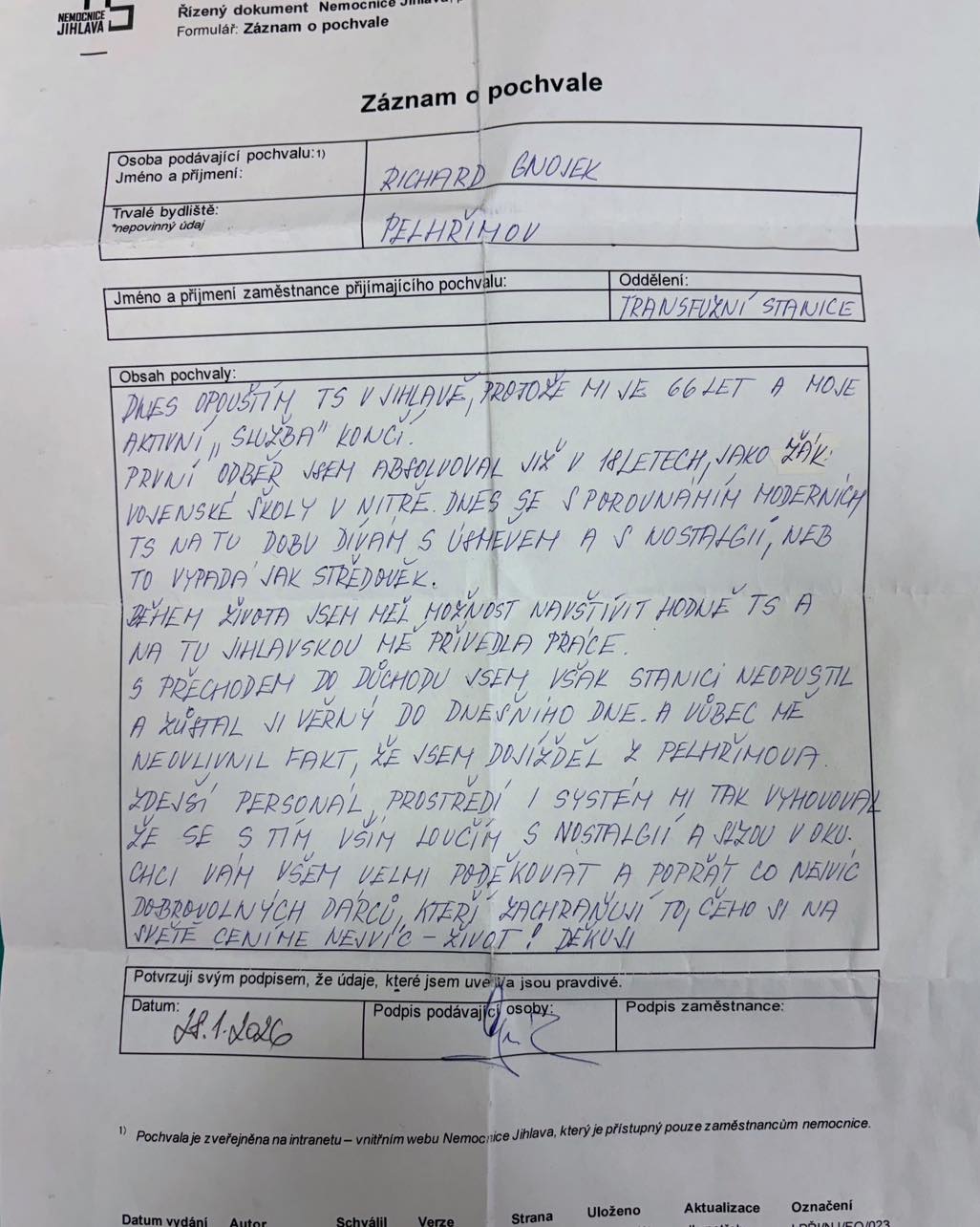 28. leden 2026. Den, který se zřejmě už navždy zapíše do paměti dlouhodobému dárci krve. Ten den totiž šestašedesátiletý Richard Gnojek z Pelhřimova pomáhal naposledy. Jak sám říká, během svého života měl možnost navštívit hodně transfuzních stanic, nejvíce mu ale vyhovovala právě ta v Jihlavě.